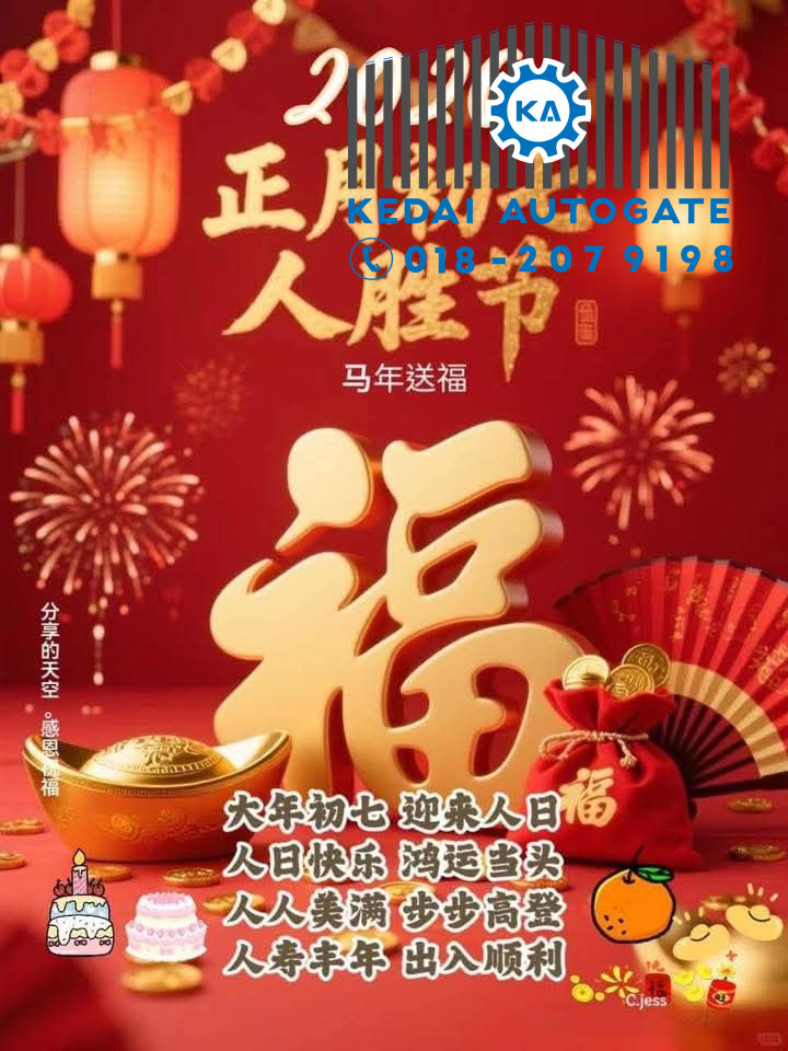 今天是农历初七- 人日节 人日象征“人人生日”,寓意添福添寿、万事顺意,是一个充满好意头的日子 ✨ 在这吉祥的日子里,Kedai Autogate 诚心向所有客户与朋友送上最真挚的祝福 ❤️愿大家:* 七星高照,好运常在* 天喜、地喜、业喜、财喜、家喜、事喜、人喜* 出入平安,事事顺心* 生意兴隆,财源广进 新的一年,我们依然专注为客户提供专业与可靠的自动门与门禁服务:* 自动门安装与维修* 门禁系统(Autogate & Wiring)解决方案* 住宅与商业单位安全升级* 电动门系统检查与保养* 电动门技术支援与故障排查 我们以贴近本地市场需求的服务方式,快速响应,合理报价,用心做好每一个工程,确保系统稳定耐用,让客户用得安心、放心。 感谢大家一直以来的支持 🙏Kedai Autogate 继续为您的家居与商业安全把关。